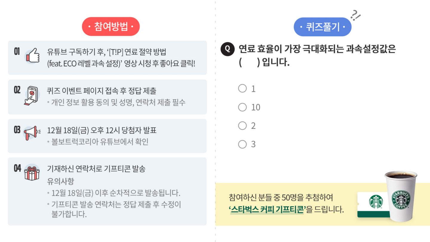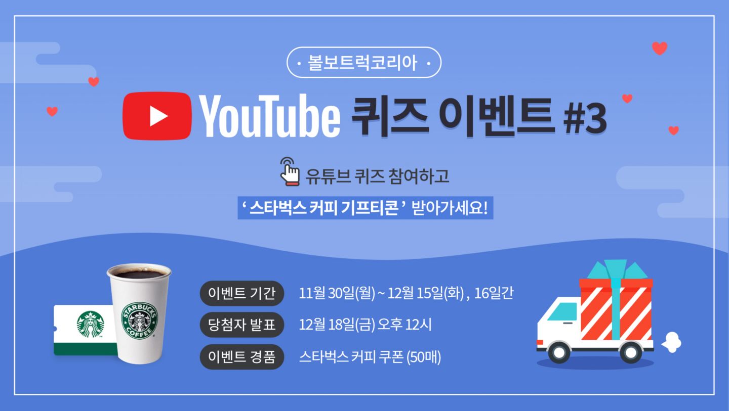 유튜브 퀴즈 참여하고 '스타벅스 커피 기프티콘' 받아가세요! 이벤트 기간 : 11월 30일(월) ~ 12월 15일(화) , 16일간 당첨자 발표 : 12월 18일(금) 오후 12시 이벤트경품 : 스타벅스 커피 기프티콘(50매)